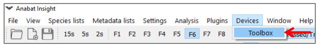 - Open Anabat Insight. Under the Devices menu, select Toolbox.